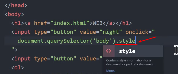 자, 우리가 이제 선택을 했으니까 body 태그의 style 이라는 속성을 어떻게 자바스크립트로 넣을 수 있는 가를 알아보자!