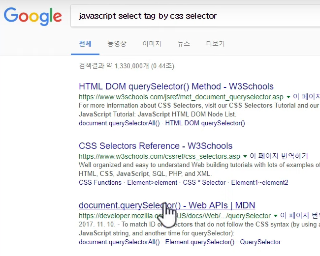 document.querySelector라는 명령문을 이용해서 selector를 넣으라 되어있는데
