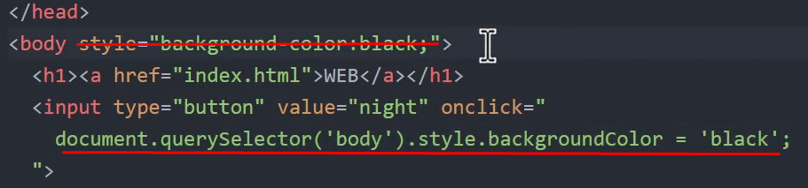 그럼 이 버튼이 클릭됐을 때 <body>태그의 스타일 속성을 동적으로 변하게 하고 싶다.