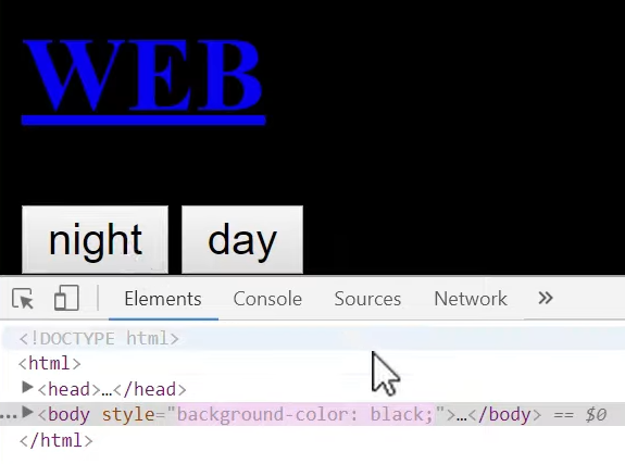 night 버튼을 클릭하면 body 태그의 CSS가 변경되는 것을 볼 수 있다!
