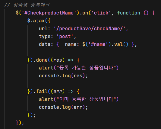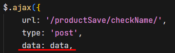 'productSave/checkName/' URL로 POST 방식의 Ajax를 전송하는 코드이다. 요청 데이터에는 입력된 상품명을 담고 있다.