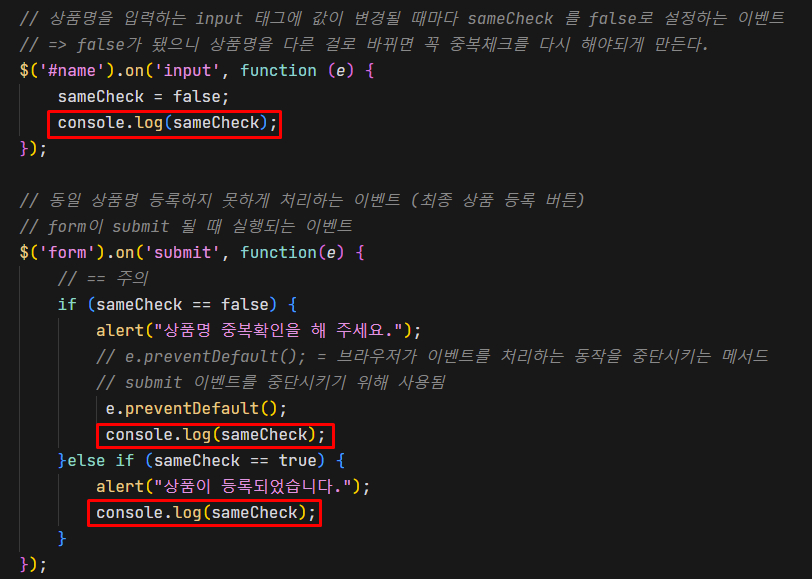 - 기존에 없는 상품명인걸 체크했지만 값을 다시 바꾼 뒤 중복체크 없이 상품 등록 완료 버튼을 누를 수도 있지 않은가? ➡ ⭐ 그렇기 때문에 상품 등록 완료 버튼에서 중복체크 된 상품명의 값이 바뀌었는 지 인지를 해야 함! (자바스크립트 onChange 활용) - 이벤트