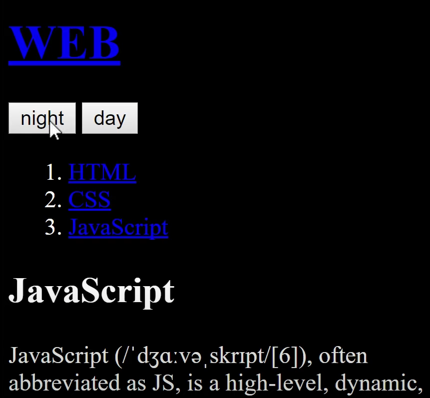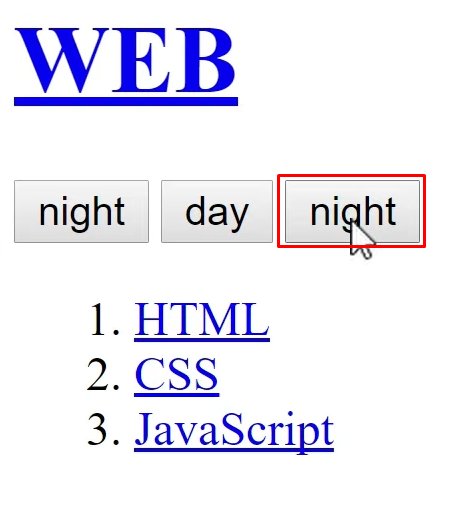 | [생활코딩 JavaScript] 12강. 자바스크립트로 HTML, CSS 동적으로 만들기(주간모드, 야간모드) (0) | 2023.04.10 |