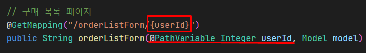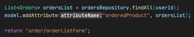 구매목록을 findAll 메서드로 가져와서 orderList 라는 객체에 담아주었고,