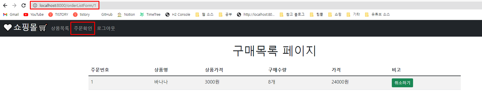 1번 유저(ssar)로 로그인 해서 헤더의 주문확인 탭을 누르면 구매목록 페이지가 성공적으로 뜰 것이다✨🎉