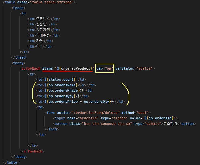 jsp에서 forEach문을 사용해 model에 담은 orderedProduct를 가져오고 이름이 너무 기니까 op라고 정해주었다.
