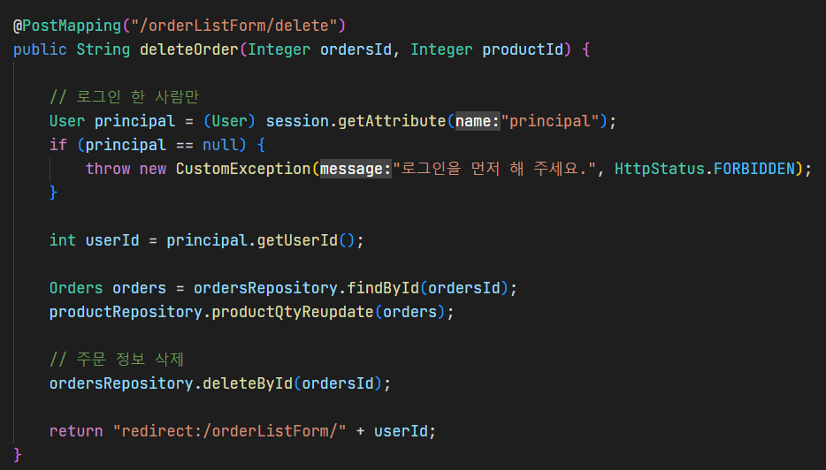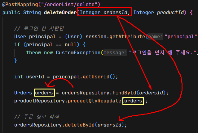 (findById로 찾은 orders의 정보에 productId 데이터도 들어있기 때문에 따로 매개변수로 넣지 않아도 된다!)