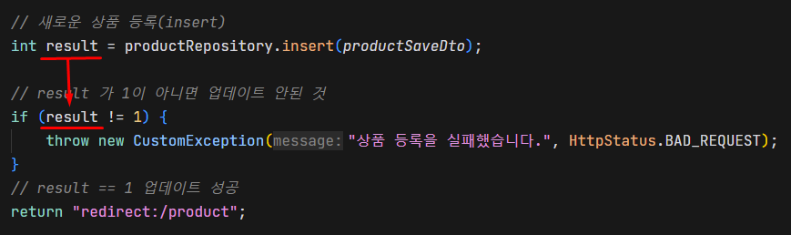 result 값이 1이 아니라면 예외처리를 해 준다.