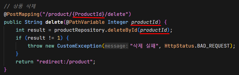상품 삭제의 productId 역시 상품 상세 페이지에서 연결되는 것이므로 상세 페이지에서 가져온 값이다!
