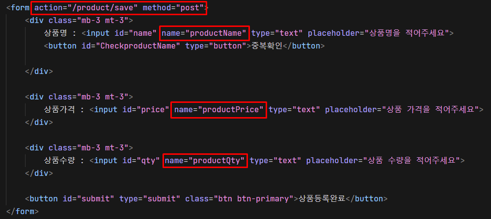 input 태그의 name 값은 ProductSaveDto와 이름을 맞춰주었다.