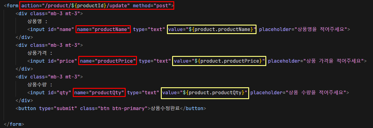 <input id="name" name="productName" type="text" value="${product.productName}" placeholder="상품명을 적어주세요">