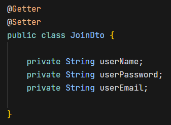 회원가입 시에는 role이 필요 없으므로 이름, 패스워드, 이메일만 받았다.