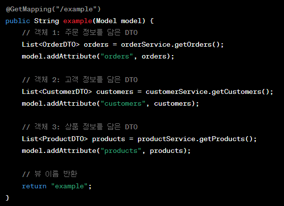 이 때, 컨트롤러에서 처리된 데이터를 뷰에서 사용할 수 있도록 Model 객체에 담아서 전달한다.
