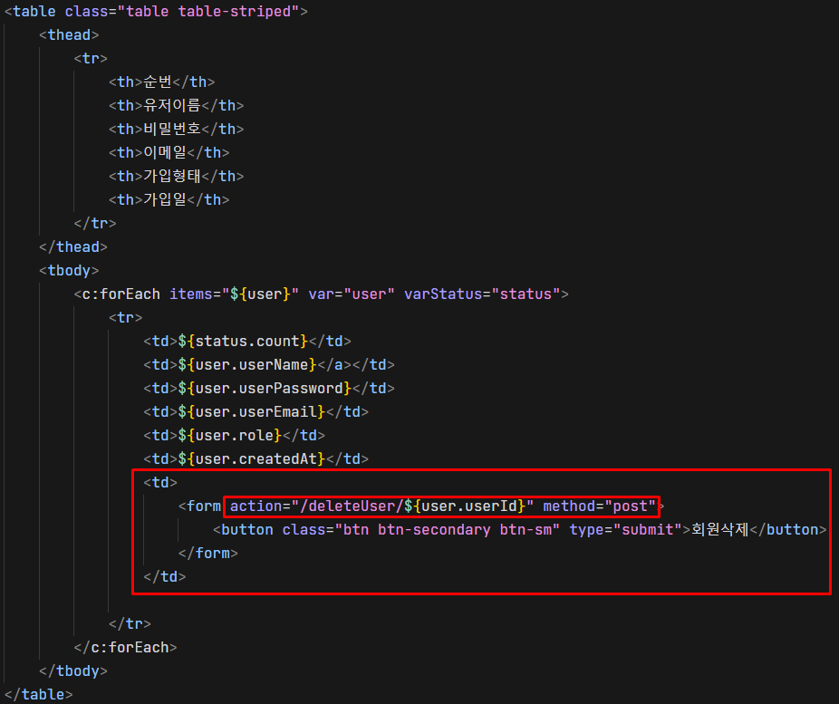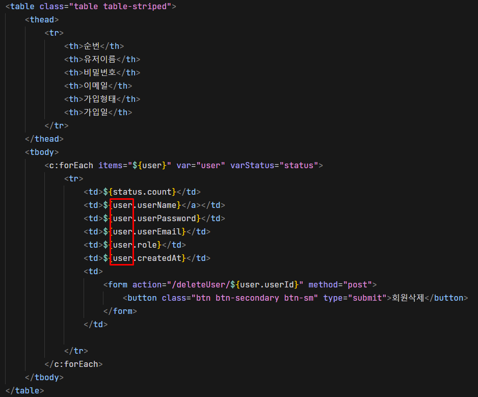 model 객체에 담은 userList를 JSP 뷰에 가져와 사용하였다!