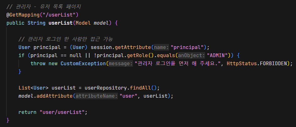 관리자만 접근 가능해야 하기 때문에 권한 체크를 제일 먼저 해 주었다.