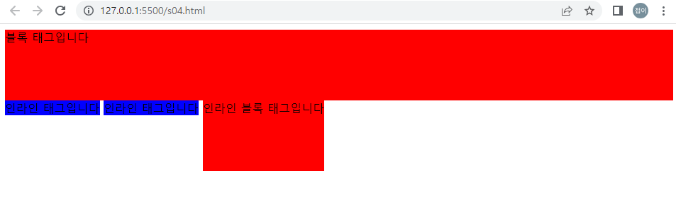 💡 블록은 한줄을 다 차지하고 높이와 넓이 세팅 가능 인라인은 한 줄에 여러 개 들어간다. 대신 높이와 넓이 세팅이 불가능.