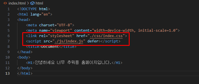 위 처럼 CSS와 JavaScript를 폴더 안에 파일로 따로 정리해두면 HTML 페이지에 링크를 걸어 불러와 주어야 적용이 된다.