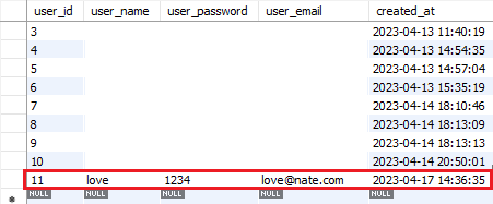 세팅 때 insert 쿼리문에 created_at을 빠뜨려서 추가해 주었다